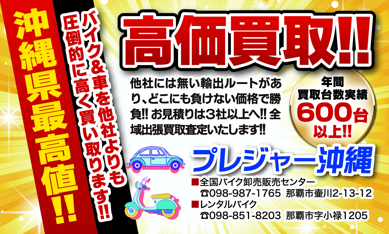バイク買取は、県内トップクラスの実績を誇るプレジャー沖縄にお任せください!